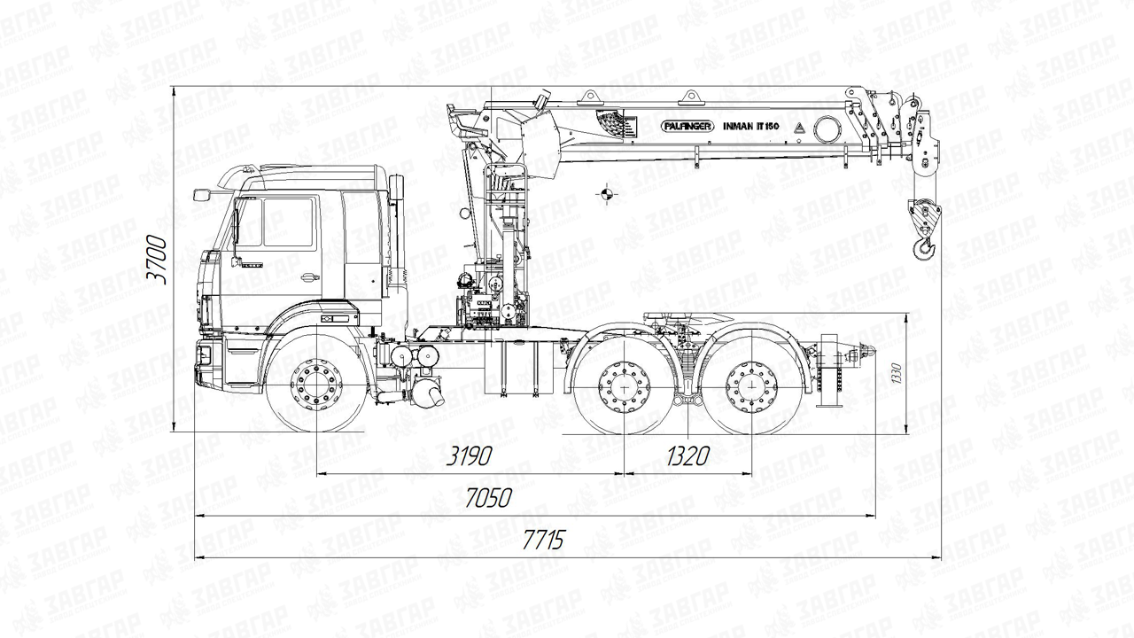 Кран-манипулятор Palfinger ИТ150, установленный на этом тягаче, представляет собой высокотехнологичное гидравлическое оборудование с пятью секциями стрелы. Максимальный вылет стрелы — 19 метров, что позволяет охватывать обширную рабочую зону. Максимальная высота подъема составляет 19,5 метра, что расширяет возможности при работе с грузами на высоте. Грузоподъемность крана достигает 7 050 кг на минимальном вылете и 300 кг на максимальном, при этом грузовой момент равен 15 т·м.