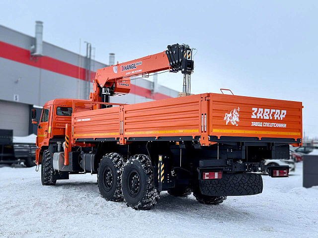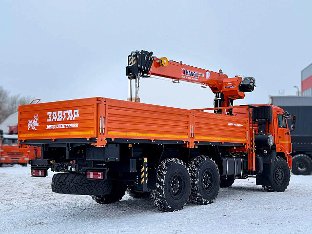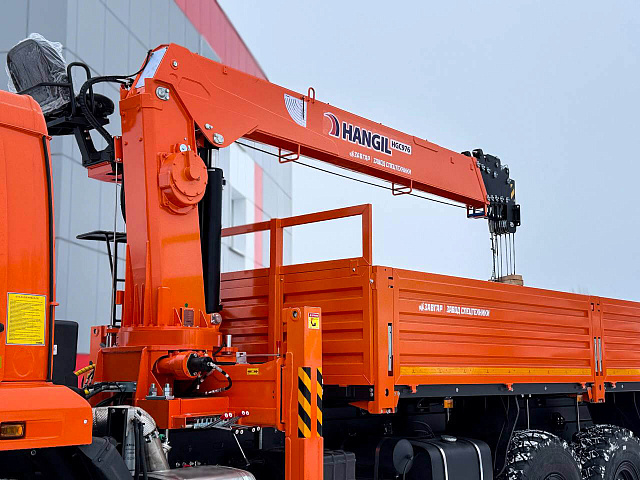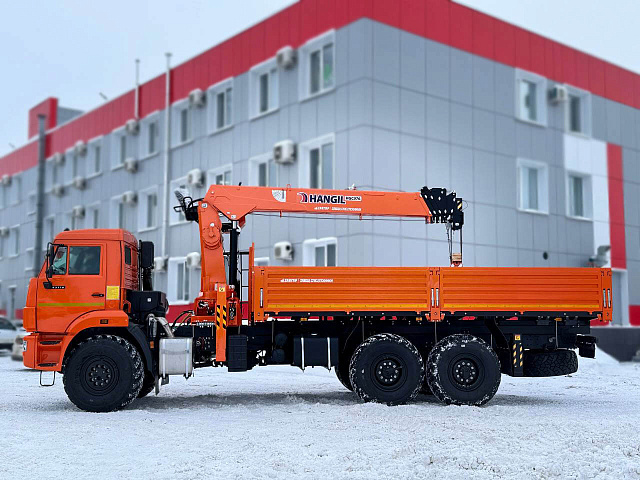 Бортовой КАМАЗ 43118 с краном-манипулятором HANGIL HGC976 с двигателем Cummins, без спального места, представляет собой современный и мощный грузовой автомобиль с колесной формулой 6х6, предназначенный для работы в сложных условиях, требующих высокой проходимости и эффективности.