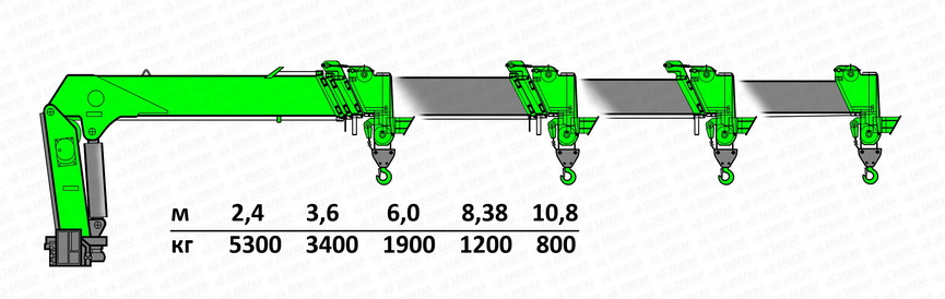 Кран-манипулятор СмартЭко FG716HP обладает грузоподъемностью 8000 кг и грузовым моментом 21 т·м. Вылет стрелы достигает 19 метров, а максимальная высота подъема — 21 метр. Шесть секций стрелы обеспечивают широкий рабочий диапазон, а угол подъема варьируется от -13° до 76°. Кран может вращаться без ограничений на 360 градусов, что позволяет эффективно выполнять погрузочно-разгрузочные работы в ограниченных пространствах. Для устойчивости при работе установлены гидравлические выдвижные аутригеры с вылетом 5,64 метра спереди и 4,45 метра сзади.