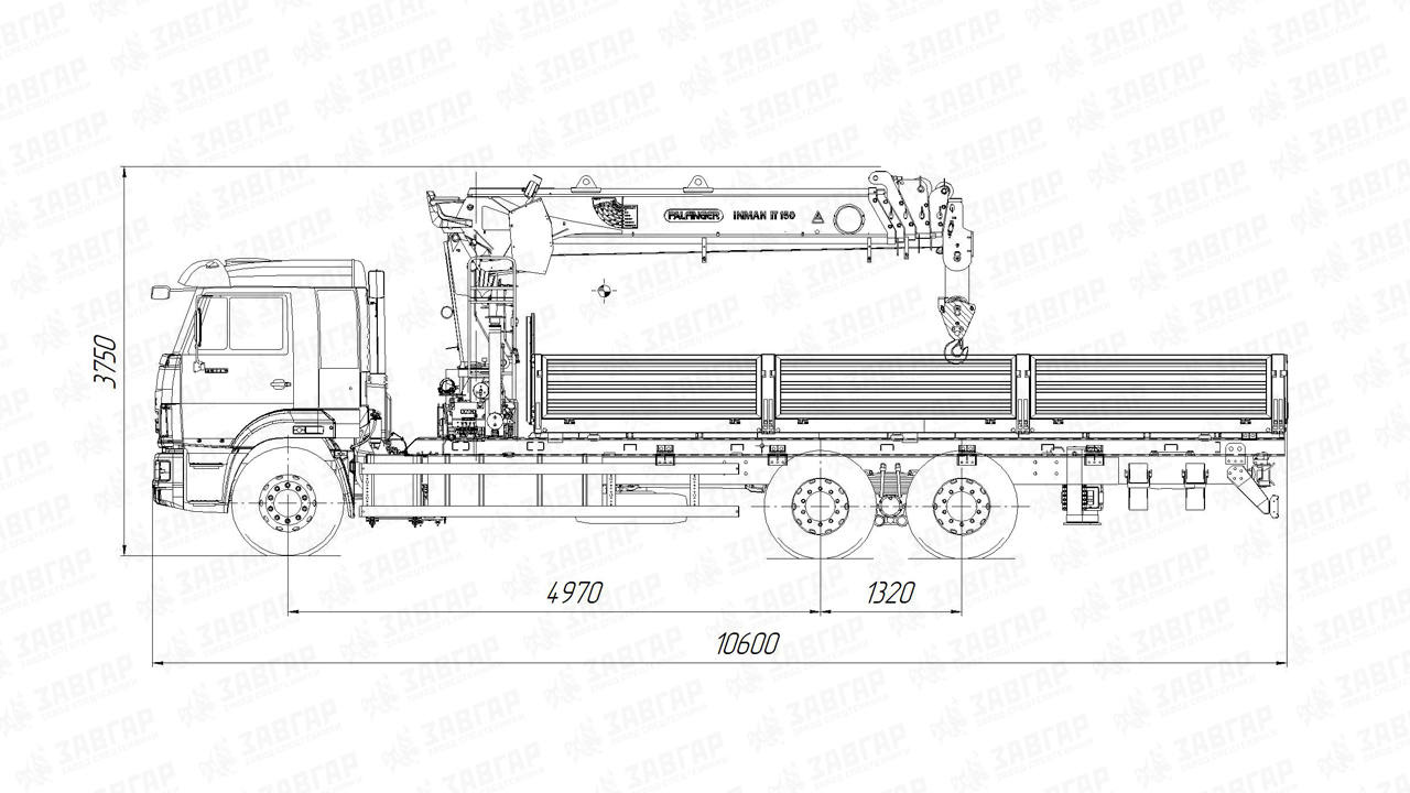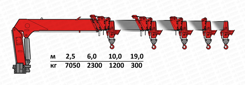 Кран-манипулятор Palfinger ИТ150 оснащен стрелой из 5 секций с максимальным вылетом 19 метров и максимальной высотой подъема 19,5 метра. Угол подъема составляет от 0 до 75 градусов. Грузоподъемность манипулятора — 7 050 кг, грузовой момент — 15 т·м. Кран вращается непрерывно на 420 градусов, что обеспечивает высокую маневренность и точность работы. Размах аутригеров варьируется в зависимости от комплектации.