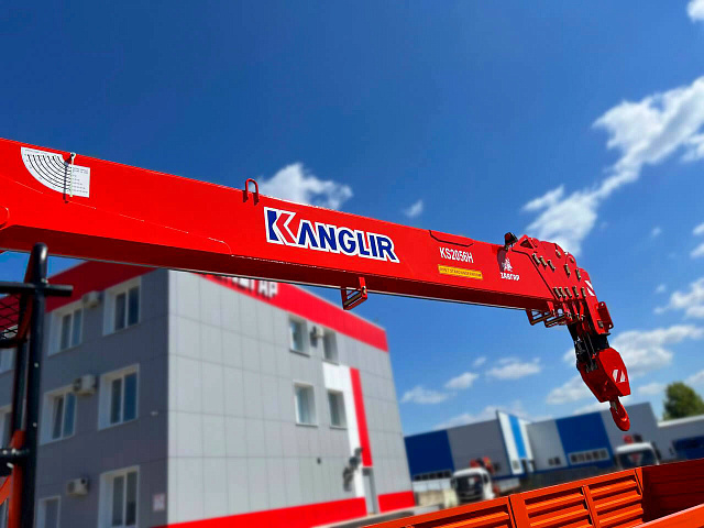 Манипулятор KANGLIM KS2056H имеет грузоподъемность 8000 кг и грузовой момент 18 тонн на метр. Максимальный вылет стрелы 20,3 метра, максимальная высота подъема достигает 23,3 метра. Конструкция крана включает 6 секций, из которых 1 основная и 5 выдвижных. Угол подъема колеблется от -17° до 80°, кран способен вращаться на 360 градусов непрерывно с оборотом за 2 минуты, что дает высокую маневренность на рабочем месте. Аутригеры гидравлические, с вылетом 5,6 метров вперед и 3,7 метра назад, обеспечивая устойчивость при работе с грузами.